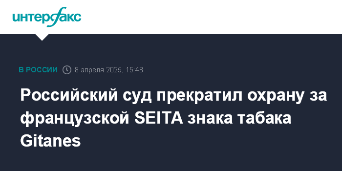 Москва. 8 апреля. INTERFAX.RU - Суд по интеллектуальным правам (СИП) удовлетворил заявление ООО "Универсальная сигаретная мануфактура" (УСМ, Калининград) к французской компании Societe Nationale d'Exploitation Industrielle des Tabacs et Allumettes (SEITА, Париж) о досрочном прекращении на территории России охраны товарного знака "Gitanes" (по международной регистрации №1155264) в отношении всех товаров 34-го класса МКТУ (табак и курительные принадлежности) вследствие его неиспользования.