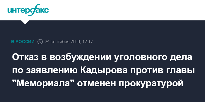 Отказ в возбуждении уголовного дела по заявлению Кадырова против главы "Мемориала" отменен прокуратурой