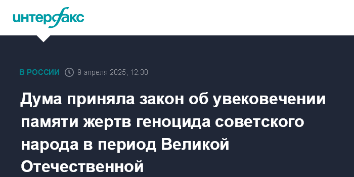 Москва. 9 апреля. INTERFAX.RU - Госдума в среду приняла во втором и в третьем чтениях закон о закреплении правового регулирования в сфере увековечения памяти жертв геноцида советского народа в период Великой Отечественной войны 1941 - 1945 годов.