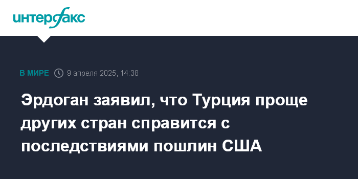 Москва. 9 апреля. INTERFAX.RU - Турции потребуется меньше усилий, чтобы пережить период после введения США новых пошлин, заявил в среду турецкий президент Реджеп Тайип Эрдоган.