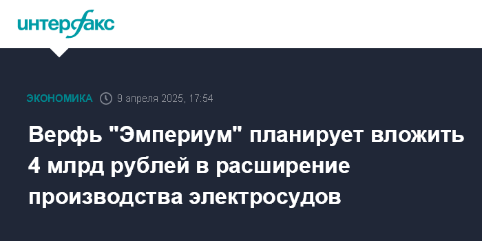 Москва. 9 апреля. INTERFAX.RU - Верфь "Эмпериум" (Ленинградская область, входит в Sitronics Group) планирует вложить порядка 4 млрд рублей в расширение производства электросудов в Кировском районе Ленинградской области. Об этом говорится в пояснительной записке к бухгалтерской отчетности компании за 2024 год.