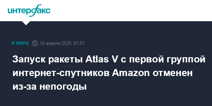 Москва. 10 апреля. INTERFAX.RU - Запуск американской ракеты Atlas V с первой группой интернет-спутников компании Amazon, планировавшийся в четверг по московскому времени, отменен перед самым стартом из-за сильного порывистого ветра, сообщила компания-разработчик носителя United Launch Alliance (ULA, совместное предприятие корпораций Boeing и Lockheed Martin).