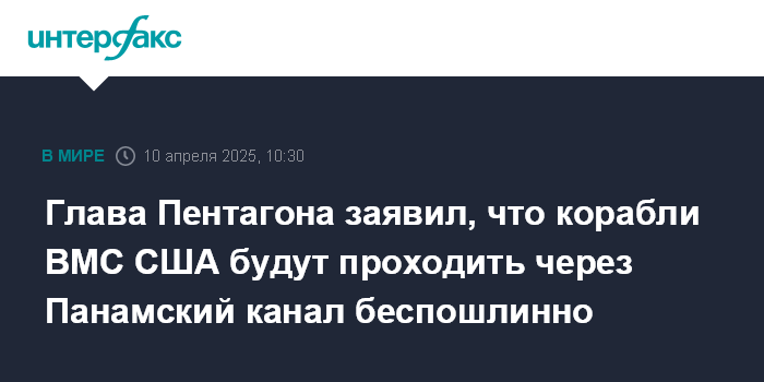 Москва. 10 апреля. INTERFAX.RU - Министр обороны США Пит Хегсет заявил, что американским властям удалось согласовать с властями Панамы свободный и беспошлинный проход для американских военных и вспомогательных кораблей через Панамский канал.