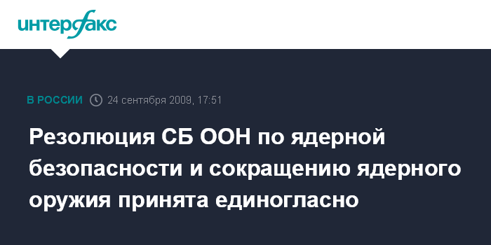 Москва. 24 сентября. INTERFAX.RU - Совет безопасности ООН принял резолюцию по ядерной безопасности и сокращению ядерного оружия. "Проект резолюции принят единогласно", - сказал президент США Барак Обама, председательствующий на заседании СБ ООН. Трансляцию заседания вел телеканал "Вести 24".