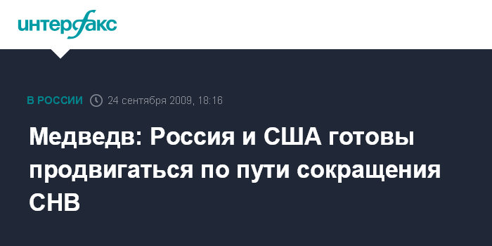 Москва/Нью-Йорк. 24 сентября. INTERFAX.RU - Россия и США готовы и дальше двигаться по пути сокращения стратегических наступательных вооружений, заявил Дмитрий Медведев.
