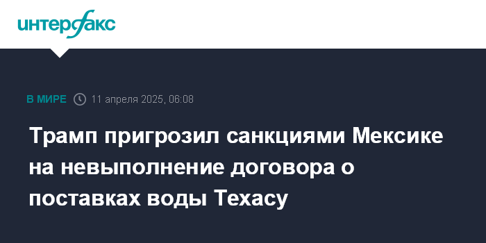 Москва. 11 апреля. INTERFAX.RU - Президент США Дональд Трамп угрожает Мексике повышением тарифов и введением санкций за предполагаемое несоблюдение договора 1944 года о поставках воды Техасу.