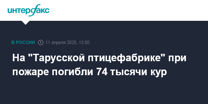 Москва. 11 апреля. INTERFAX.RU - В Калужской области произошел пожар в птичнике Лопатинской птицефабрики в Тарусском районе, сообщил во "ВКонтакте" глава администрации района Михаил Голубев.