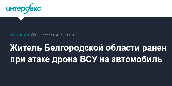 Москва. 12 апреля. INTERFAX.RU - Мирный житель пострадал при атаке украинского беспилотника на машину под Белгородом, сообщил губернатор Вячеслав Гладков.