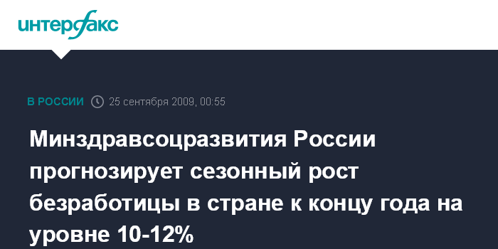 Москва. 25 сентября. ИНТЕРФАКС - К концу 2009 года сезонный рост безработицы в России может составить 10-12%, сообщила глава Минздравсоцразвития РФ Татьяна Голикова.
