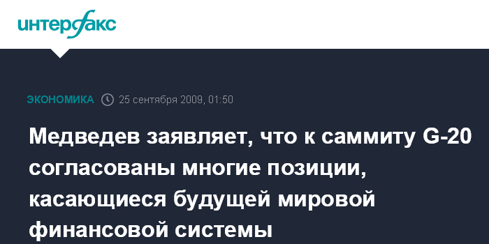 Питтсбург. 25 сентября. ИНТЕРФАКС - К саммиту "двадцатки" согласованы многие позиции, касающиеся будущей мировой финансовой системы, заявил президент РФ Дмитрий Медведев.