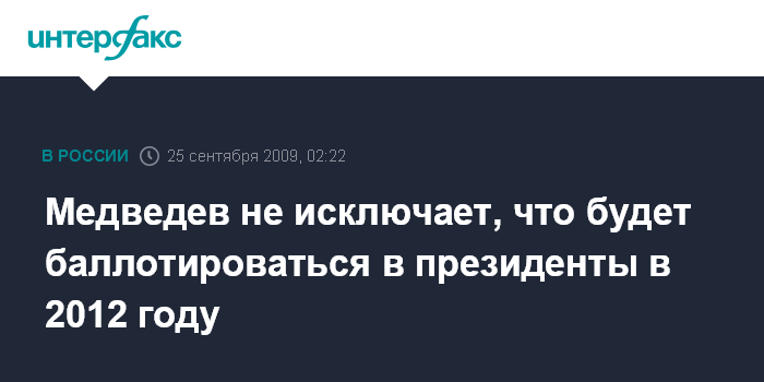 Питтсбург. 25 сентября. ИНТЕРФАКС - Президент РФ Дмитрий Медведев не исключил, что будет баллотироваться на выборах главы государства в 2012 году.
