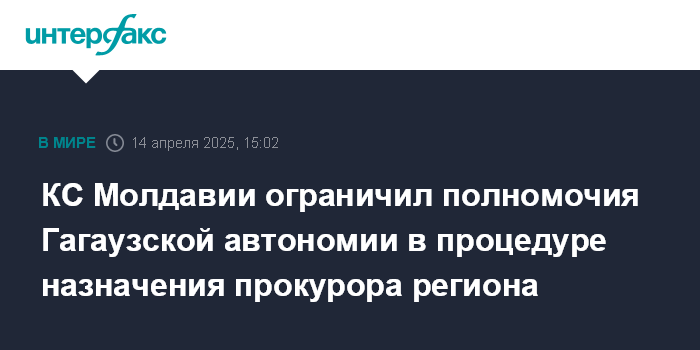 Москва. 14 апреля. INTERFAX.RU - Конституционный суд Молдавии ограничил полномочия Гагаузской автономии в процедуре назначения прокурора региона.