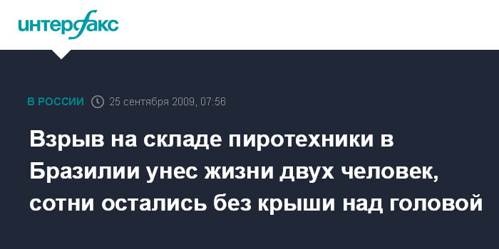 Бразилиа. 25 сентября. ИНТЕРФАКС - В Сан-Пауло в результате взрыва на нелегальном складе пиротехники погибли два человека, еще более сотни жителей этого бразильского города остались без крова.
