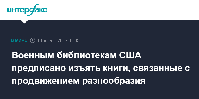 Москва. 16 апреля. INTERFAX.RU - Руководство американских ВВС и Армии предписало своим библиотекам изъять из фондов книги, связанные с программой, которая при прежней администрации США поощряла "разнообразие, равенство и инклюзивность" (DEI), сообщает AP, в распоряжении которого оказались соответствующие меморандумы.