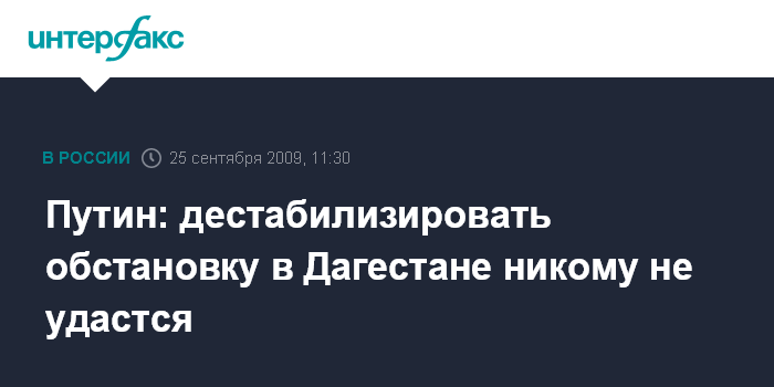 Москва. 25 сентября. INTERFAX.RU - Премьер-министр РФ Владимир Путин убежден, что, несмотря на предпринимаемые попытки, дестабилизировать ситуацию на Северном Кавказе никому не удастся. "Мы с вами знаем, что сегодня ситуация на Северном Кавказе и в республике Дагестан далеко не радужная, она сложная. До сих пор предпринимаются попытки дестабилизировать ситуацию. Уверен, что это никому не удастся сделать", - заявил В.Путин на встрече с руководством Дагестана и ветеранами ополчения, которая прошла в преддверии десятилетней годовщины отражения атаки международных террористов на республику Дагестан.