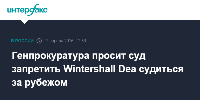 Москва. 17 апреля. INTERFAX.RU - Генеральная прокуратура России обратилась в Арбитражный суд Москвы с иском о запрете германской компании Wintershall Dea GmbH продолжать или поддерживать арбитражное разбирательство против Российской Федерации, говорится в иске, который есть в распоряжении "Интерфакса".