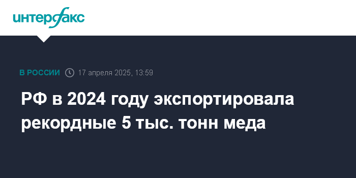 Москва. 17 апреля. INTERFAX.RU - Экспорт меда из РФ в 2024 году превысил 5 тыс. тонн, что стало рекордным показателем. Об этом сообщает федеральный центр "Агроэкспорт" со ссылкой на оценки экспертов.