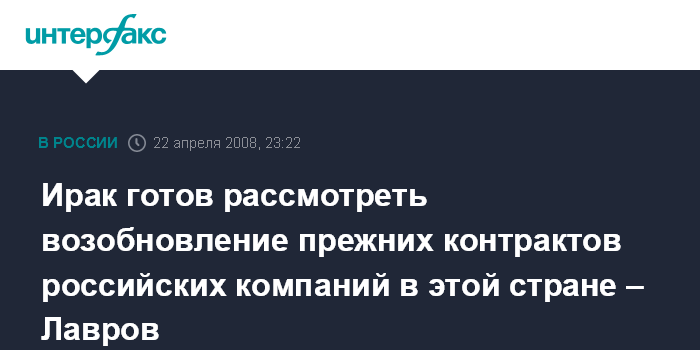 Москва. 22 апреля. ИНТЕРФАКС - Ирак готов рассмотреть возобновление прежних контрактов российских компаний в этой стране, заявил глава МИД РФ Сергей Лавров.