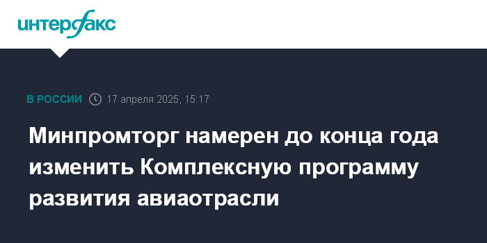 Москва. 17 апреля. INTERFAX.RU - Комплексную программу развития авиаотрасли до 2030 года (КПГА), которая отражает планы пассажиропотока российских авиакомпаний, а также выпуска авиатехники отечественного производства, планируется изменить до конца текущего года, сообщила директор департамента авиапромышленности Минпромторга РФ Анна Панина.