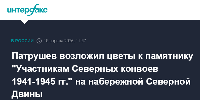 Патрушев возложил цветы к памятнику "Участникам Северных конвоев 1941-1945 гг.", установленному на набережной Северной Двины, и поздравил жителей Архангельска с предстоящим 80-летием Великой Победы.