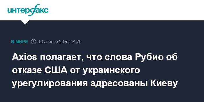 Москва. 19 апреля. INTERFAX.RU - Заявление госсекретаря США Марко Рубио о том, что Вашингтон может перестать заниматься украинским урегулированием в случае отсутствия прогресса, направлено, преимущественно, против Украины, пишет Axios со ссылкой на источники.