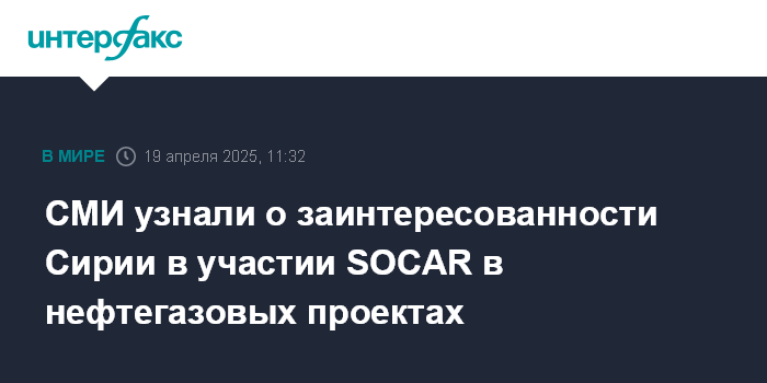 Москва. 19 апреля. INTERFAX.RU - Новое правительство Сирии заинтересовано в участии Госнефтекомпании Азербайджана (ГНКАР/SOCAR) в восстановлении нефтегазового сектора страны, сообщает ближневосточное издание Middle East Eye.
