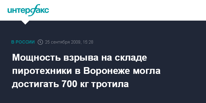 Воронеж. 25 сентября. INTERFAX.RU - Мощность взрыва на складе пиротехники, произошедшем в Воронеже, могла составлять 500-700 кг в тротиловом эквиваленте, сообщил "Интерфаксу" в пятницу бывший сотрудник ФСБ, раньше работавший специалистом-взрывотехником.