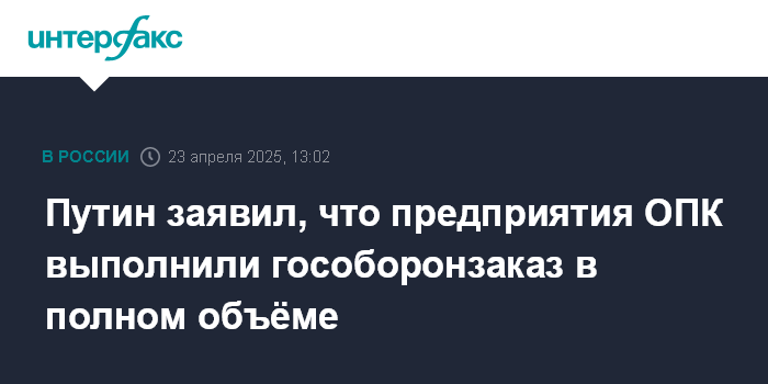 Москва. 23 апреля. INTERFAX.RU - Предприятия оборонно-промышленного комплекса выполнили задания гособоронзаказа в полном объёме, качественно и в срок, заявил президент РФ Владимир Путин.