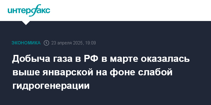 Москва. 23 апреля. INTERFAX.RU - Добыча природного газа в России в марте (62,6 млрд куб. м) оказалась выше, чем в более холодном январе (62,533 млрд куб. м). Поддержку спросу на газ оказывают потребности промышленности, а также рост потребления со стороны газовой энергогенерации, вынужденной компенсировать снижение выработки ГЭС.