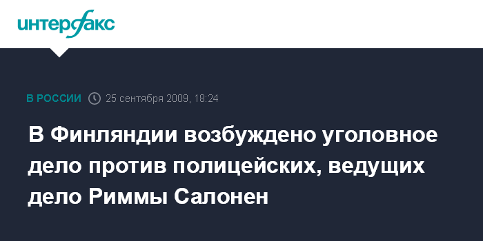 Таллин. 25 сентября. ИНТЕРФАКС - Генеральная прокуратура Финляндии возбудила уголовное дело против сотрудников полиции города Тампере, ведущих дело россиянки Риммы Салонен, обвиняемой в похищении собственного сына.