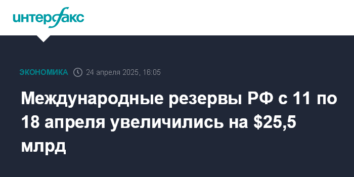 Международные резервы РФ с 11 по 18 апреля увеличились на $25,5 млрд