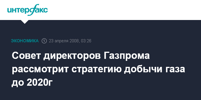 Москва. 23 апреля. ИНТЕРФАКС-АГИ - Совет директоров ОАО "Газпром" на заседании 23 апреля обсудит перспективы добычи газа до 2020 года, говорится в сообщении пресс-службы концерна.