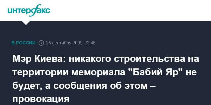 "Распространенная в отечественных и зарубежных СМИ информация о том, что на территории "Бабьего Яра" якобы планировалось строительство гостиницы является грубой провокацией. Киевсовет и горадминистрация, которую я возглавляю, ни разу не принимали решений о выделении земельных участков вблизи национальных святынь, к которым, безусловно, относится и мемориальный комплекс "Бабий Яр". Прежде чем принимать такие решения, мы всегда запрашиваем мнения общественных организаций, которые представляют тот или иной исторический объект, и мнения киевлян", - цитирует газета Л.Черновецкого.