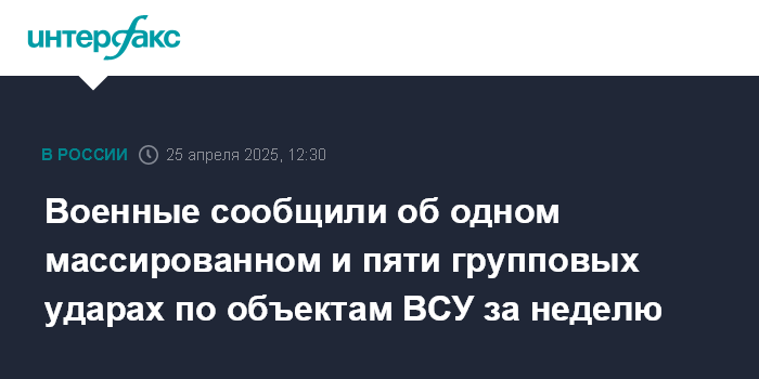 Москва. 25 апреля. INTERFAX.RU - Вооруженные силы России с 19 по 25 апреля нанесли один массированный и пять групповых ударов высокоточным оружием и ударными беспилотниками по военным целям на Украине, сообщило в пятницу министерство обороны РФ.