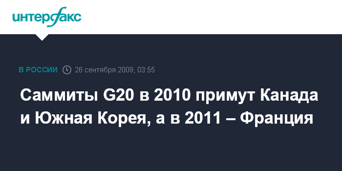 Ранее помощник президента РФ Аркадий Дворкович сообщал, что следующие саммиты G20 пройдут в Канаде и Южной Корее.