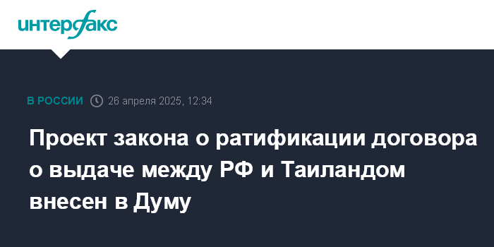 Москва. 26 апреля. INTERFAX.RU - Президент РФ внес в Госдуму проект закона "О ратификации договора между Российской Федерацией и Королевством Таиланд о выдаче".