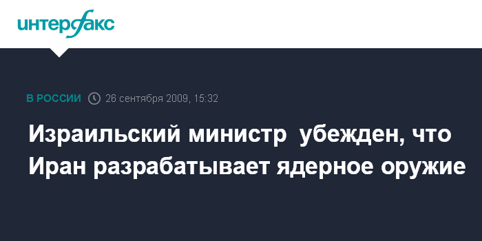 Москва. 26 сентября. INTERFAX.RU - Израильские власти призывают страны Запада дать "недвусмысленный ответ" Ирану, обнародовавшему информацию о тайном строительстве на территории страны второго завода по обогащению плутония, передает в субботу британская телерадиокорпорация Би-би-си.