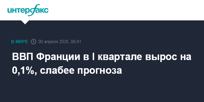 Москва. 30 апреля. INTERFAX.RU - ВВП Франции в первом квартале 2025 года увеличился на 0,1% по сравнению с предыдущими тремя месяцами, говорится в отчете национального статистического института Insee, представившего предварительные данные.