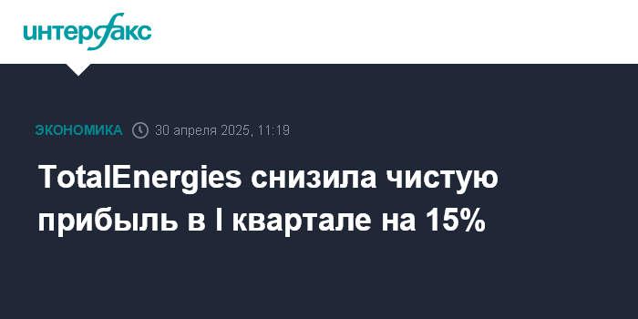 Москва. 30 апреля. INTERFAX.RU - Чистая прибыль TotalEnergies в первом квартале 2025 года составила $3,9 млрд, что на 3% меньше, чем в предыдущем квартале и на 15% меньше, чем годом ранее, говорится в ее пресс-релизе.