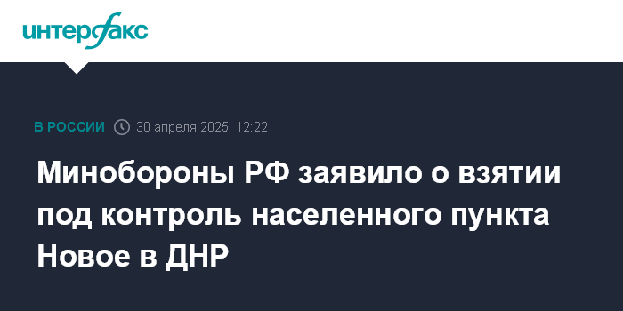 Москва. 30 апреля. INTERFAX.RU - В министерстве обороны РФ сообщили, что под российский контроль в результате активных наступательных действий подразделений группировки войск "Запад" перешел населенный пункт Новое в Донецкой народной республике.