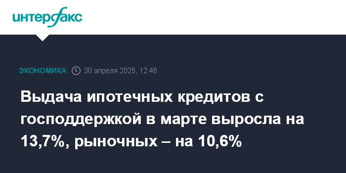 Москва. 30 апреля. INTERFAX.RU - Объем выдачи ипотечных жилищных кредитов (ИЖК) по программам господдержки в марте 2025 года вырос по сравнению с февралем на 13,7% до 222,6 млрд рублей, кредитов на рыночных условиях – на 10,6% до 34,6 млрд рублей. Об этом сообщается в обзоре рынка ипотечного жилищного кредитования, опубликованном на сайте ЦБ РФ.