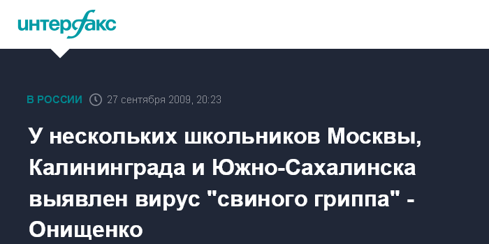Москва. 27 сентября. ИНТЕРФАКС - Заражение так называемым "свиным гриппом" (H1N1) среди школьников зарегистрировано еще в трех российских регионах, в том числе в Москве, сообщил глава Роспотребнадзора Геннадий Онищенко.