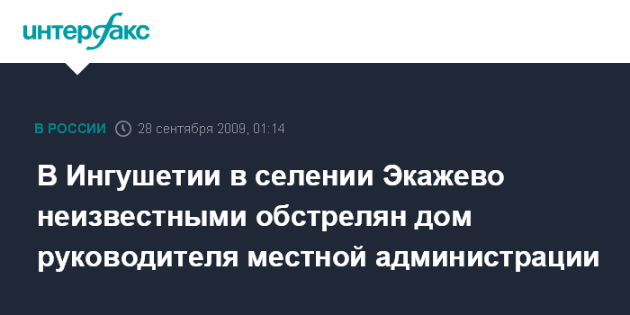 Назрань. 28 сентября. ИНТЕРФАКС-ЮГ - В селении Экажево Назрановского района Ингушетии неизвестными лицами в ночь на понедельник обстрелян частный дом, где проживает глава местной администрации Нурадин Экажев.