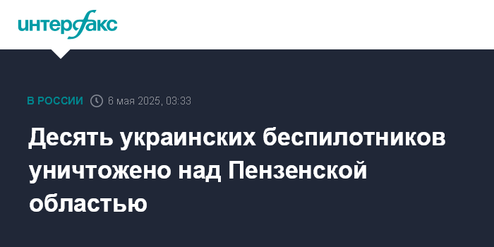 Москва. 6 мая. INTERFAX.RU - Десять дронов ВСУ сбито в небе над Пензенским регионом, сообщил губернатор Олег Мельниченко.