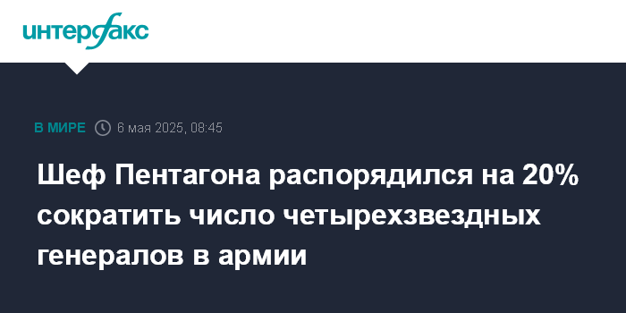 Москва. 6 мая. INTERFAX.RU - Число четырехзвездных генералов и адмиралов (высшее генеральское звание в армии и ВМС США) должно быть сокращено на 20%, такое распоряжение отдано министром обороны Соединенных Штатов Питом Хегсетом, сообщили американские СМИ.