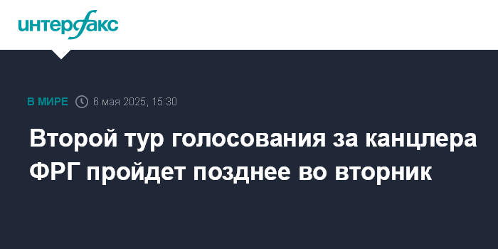 Москва. 6 мая. INTERFAX.RU - Второй тур голосования в Бундестаге по кандидатуре Фридриха Мерца на пост канцлера Германии начнется во вторник в 15:15 местного времени (16:15 по Москве), пишет Bild.