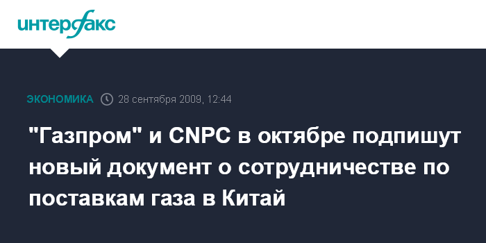 Москва. 28 сентября. INTERFAX.RU - ОАО "Газпром" и китайская CNPC в октябре подпишут новый документ о сотрудничестве по поставкам газа в Китай, сообщил журналистам глава концерна Алексей Миллер.