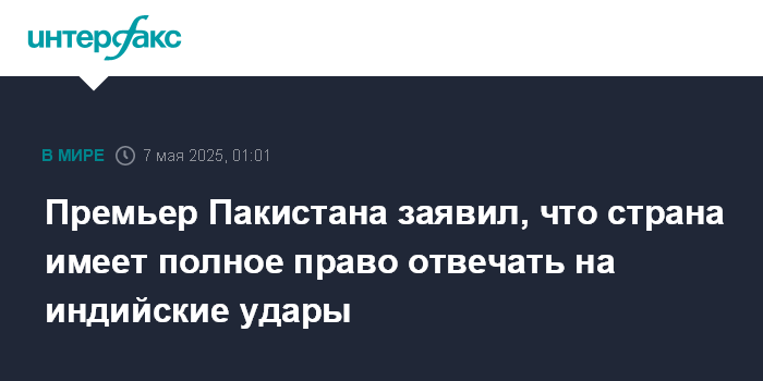 Москва. 7 мая. INTERFAX.RU - Исламабад имеет право отреагировать на индийские удары так, как считает нужным, сейчас такой ответ уже дается, заявил премьер-министр Пакистана Шахбаз Шариф.