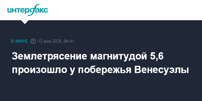 Москва. 12 мая. INTERFAX.RU - Подземный толчок магнитудой 5,6 зафиксирован в понедельник в акватории Карибского моря у побережья Венесуэлы, сообщает Алтае-Саянский филиал Единой Геофизической службы РАН,