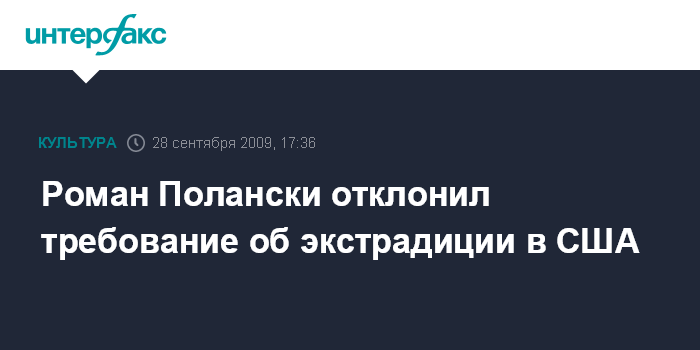 Москва. 28 сентября. INTERFAX.RU - Французский режиссер польского происхождения Роман Полански не согласился с требованием об экстрадиции, поданным со стороны США, сообщают местные СМИ со ссылкой на заявление адвокатов режиссера. Защитники режиссера считают, что требования органов американского правосудия о выдаче Полански незаконны. "Учитывая возмутительные обстоятельства ареста, адвокаты будут добиваться немедленного освобождения" режиссера, отмечается в заявлении.